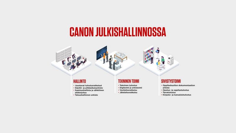 Canonin tiedonhallintaan ja tulostukseen liittyvissä ratkaisuissa yhdistyvät tavat tehostaa kuntien ja kaupunkien tietovirtojen haltuunottoa. Digitalisoimalla kuntatiedon käsittelyä ja tiedon jakamista sekä sisäisesti että kuntalaisille, saadaan kuntatyöntekijöiden arkeen tehokuutta, joka mahdollistaa keskittymisen entistä parempien palvelujen tuottamiseen.