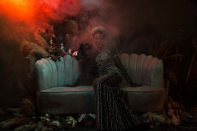 A model wearing a tulle dress with a sequinned bodice reclines on a sofa. Flames appear to be climbing the wall behind her.