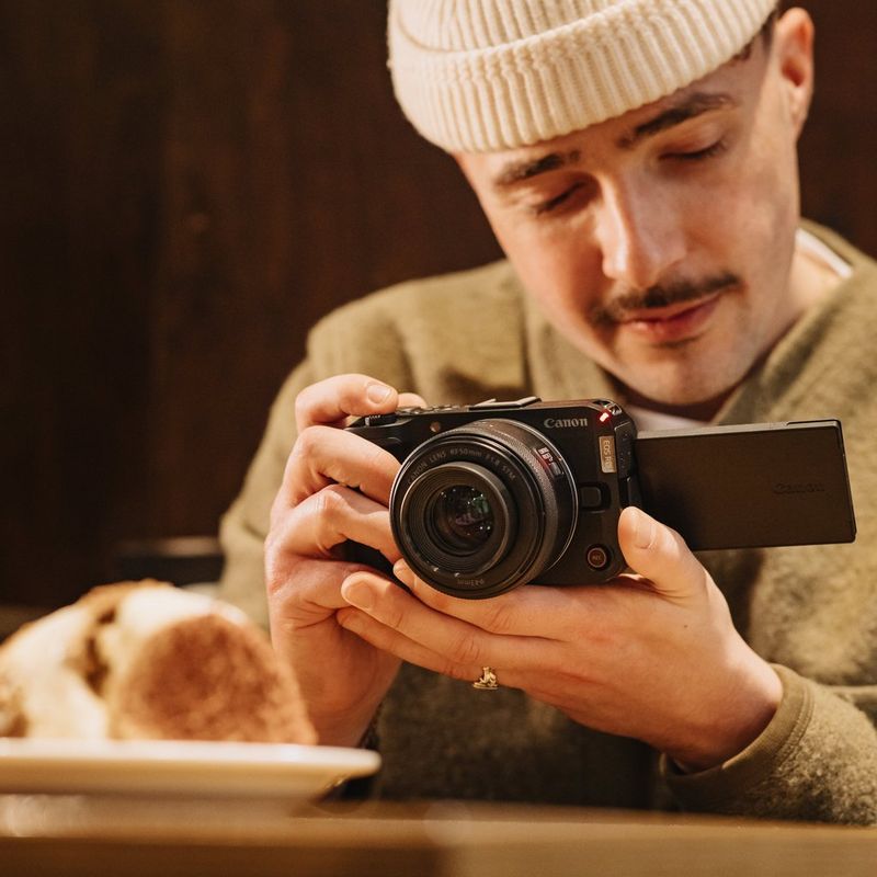 Säädä asetuksia kääntyvällä kosketusnäytöllä ja aloita kuvaaminen etupuolen tallennuspainikkeella. Lisäksi kohteen tunnistusta hyödyntävän automaattitarkennuksen ansiosta kuva pysyy terävänä. Canon EOS R50 V on suunniteltu kameraksi, jolla luodaan sosiaalisen median sisältöä, ja sen erillinen jalustakiinnike helpottaa pystysuoraa kuvausta ja videokuvanvakain vähentää kameran tärähtelyä.